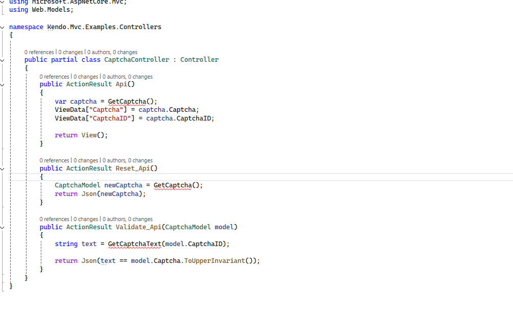 Hello, I am attempting to use your kendo captcha component for my web project when I ran into some technical difficulties invoking your API handler methods for the captcha component. I followed the instructions on the basic level from this url to help me use this component and even after copying exactly what's given here as a proof of concept I'm still getting errors related to my project not recognizing the Captcha api methods. I keep getting errors tat GetCaptcha() or GetCaptchaText() doesn't exist in the current context.