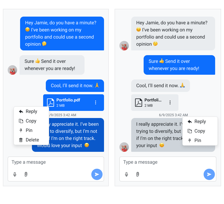 The Telerik UI for Blazor Chat offers a streamlined way to guide user interactions with built-in suggestions, suggested actions, context menu actions and toolbar actions.