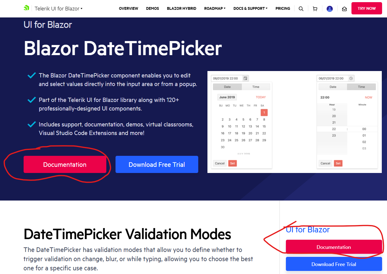 Almost all documentation buttons on https://www.telerik.com/blazor-ui/ direct you to the invalid url
