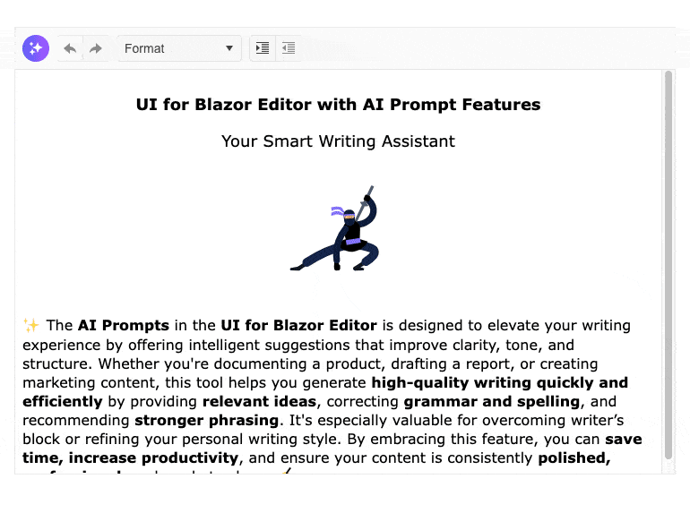 The Blazor Editor offers two flexible AI-assisted workflows: an AI Prompt component integration that appears in a side pane, and an Inline Prompt that shows up as a popup when text is selected. Both options support a range of built-in commands, such as rewriting text, correcting grammar, adjusting tone, translating content, and more.