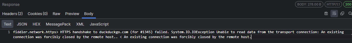 I'm unable to access DuckDuckGo with Fiddler Everywhere. I can connect to DuckDuckGo without Fiddler. I think it's because DuckDuckGo detects Fiddler. Other possibilities are that the Fiddler certificate also supports unsafe TLS 1.0 and TLS 1.1, and their server ignores the request, but I'm not sure. Can you connect to DuckDuckGo, or is this issue exclusive to me? Thanks
