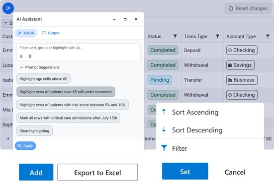 • AI Toolbar Assistant: A built-in toolbar tool that integrates an AI prompt interface directly into the Grid toolbar so users can type prompts referring to data operations like fitlering, sorting, etc.