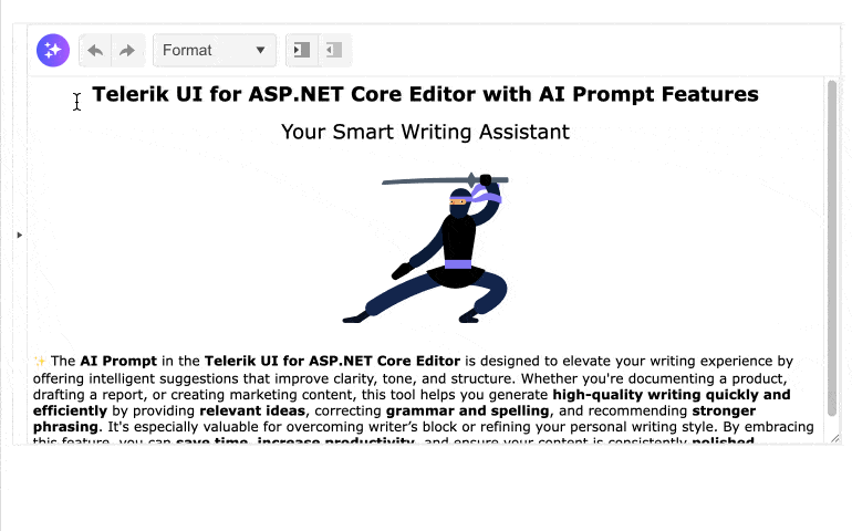 See Telerik UI for ASP.NET MVC Editor and Inline AI Prompt integration demo