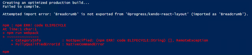 npm run webpack failing with Attempted import error: 'Breadcrumb' is not exported from '@progress/kendo-react-layout' (imported as 'Breadcrumb').