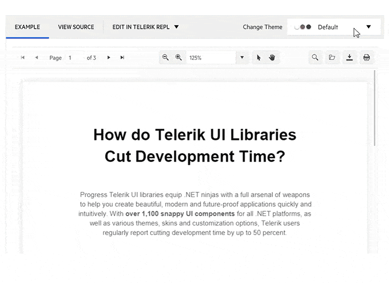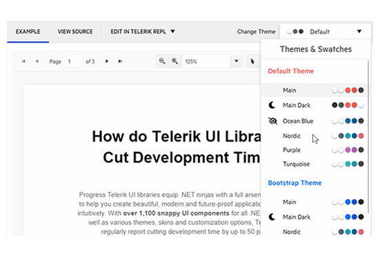 The Telerik UI for Blazor PDF Viewer component can be used with several built-in themes and color swatches, including the four most popular—Default (our own Telerik-infused styling), Material (based on the Material Design guidelines), Bootstrap and Fluent. You can enjoy plenty of customization options to match your own branding by using the Telerik SASS ThemeBuilder application, also available as a ThemeBuilder Pro version with lots of additional customization options.