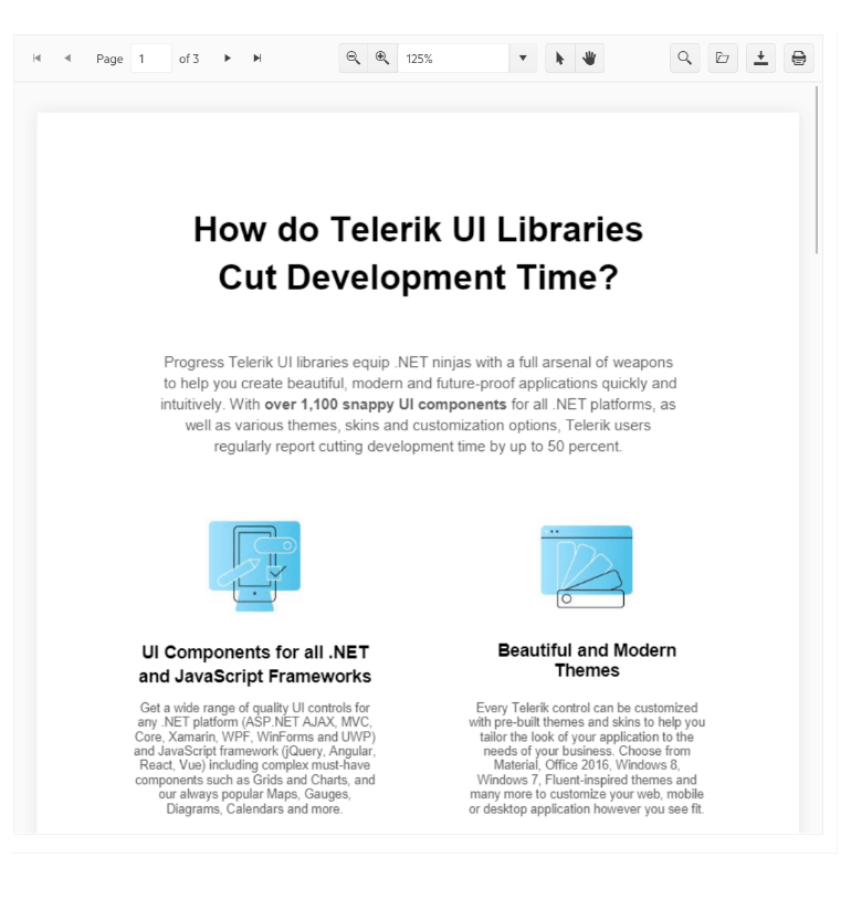 The PDFViewer component from Telerik enables you to access, open, download and view PDF files in-browser, without the need for installing any extensions or third-party tools. The control positively impacts your efficiency and productivity when dealing with software modules or entire applications for document management.