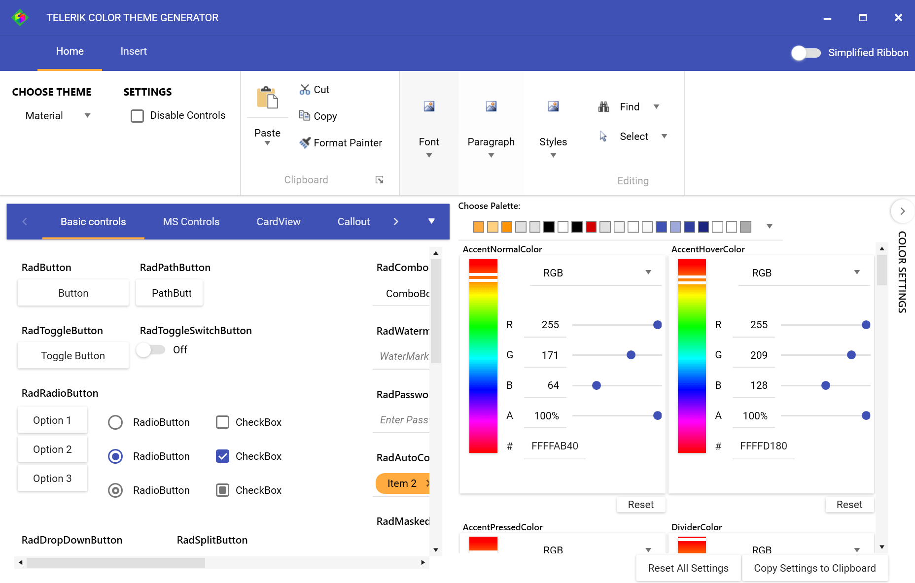 Similarly, UI for WinForms and UI for WPF include tooling to help with customizing the built-in themes. For WinForms this is the Visual Style Builder (fig. 4), and for UI for WPF this is Color Theme Generator (fig. 5).